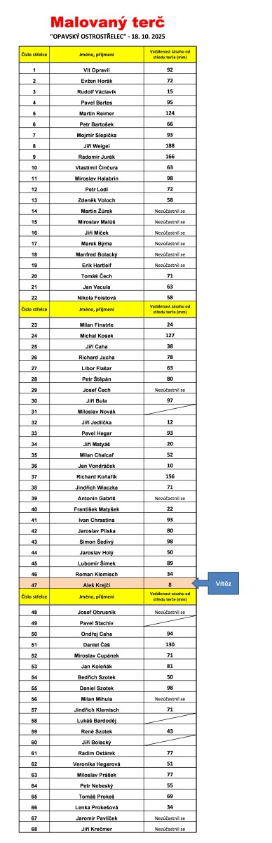 Došlo i k dalšímu vyhodnocení – zvláštní vyhodnocení hlavního závodu – o nejlepšího střelce bez ohledu na přihlášenou kategorii. Tím se stal p. Milan Finstrle, který obdržel originální obraz od malíře pana Dana Růžičky, včetně certifikátu originality a diplomu nejlepšího střelce hlavního závodu. Tímto mu k dosažení této výjimečné pozice velmi blahopřejeme. Další vítězové jednotlivých kategorií a vložených závodů jsou zveřejněny na výsledkových listinách. Věřím, že si zhlédnutím fotogalerie a výsledkových listin rádi připomenete uplynulé chvíle.